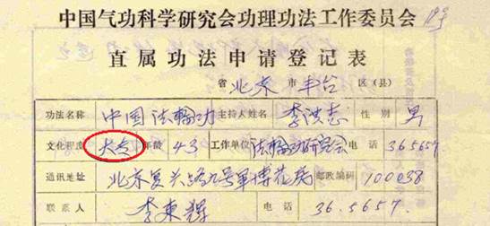 再说“学历造假”。*********在2000年的《随意所用》中承认自己没读过大学,可在上世纪90年代初(时间范围在1992至1994之间)亲笔填写的《直属功法申请登记表》中,却将文化程度填成了“大专”。这世界上有先取得大专学历,再过几年却“倒退”为高中学历的么?显然,*********在填表时骗造了假学历。不妨认真分析一下。因为文化大革命,我国大学一度停止招生。但1977年恢复了高考制度,当时国家急需有文化知识的人才,可由于文革,造成人才断档,青黄不接,因此当时只要有“同等学力”(不是学历)就可以考大学,以初中学历报考且考取的不在少数。按*********1986年取得函授高中文凭推算,他在1977至1986这连头带尾的10年中,年年有机会参加高考。假如*********有底气报名参加高考并考取了,他还用得着编造假学历吗?如果*********真能够安排“考试神迹”,为什么不给自己安排一次(至于“神佛”为什么在追求常人的学历,*********自己肯定十分清楚)呢?如果*********相信“考试神迹”,还用得着编造假学历么?