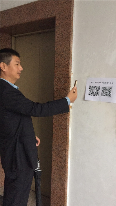 防范办工作人员指导群众关注微信公众号