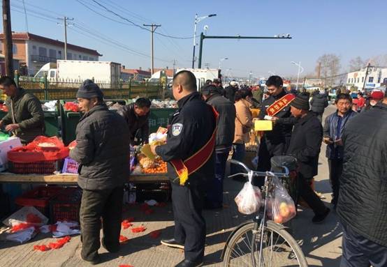 参与宣传的工作人员身披“崇尚科学、反对邪教”等宣传授带,向参加农贸大集的群众发放反邪教宣传单,并主动向群众讲解法轮功等邪教组织的骗人手段和危害,教育群众自觉抵制邪教。