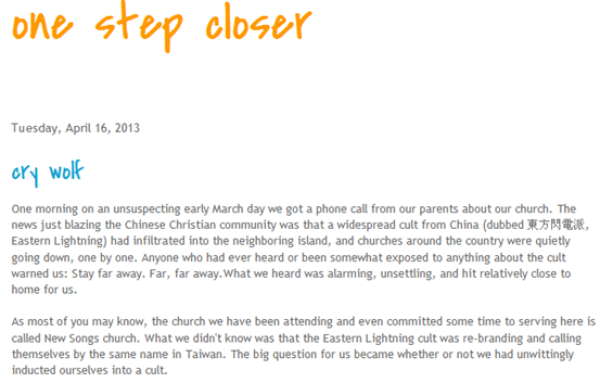 核心提示:Shiotheway,台湾人,从事教育工作。2013年4月16日,Shiotheway在其个人博客One Step Closer发表文章,通过亲身经历告诉大家全能神邪教通过贴上“新歌教会”的新标签渗入台湾,欺骗基督徒。
