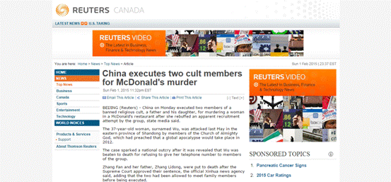 2014年6月1日,世界着名通讯社之一路透社(Reuters)发表了题为《麦当劳杀人案激起全中国愤怒》的新闻稿,报道了邪教“全能神”信徒在山东省招远市一家麦当劳快餐店打死无辜群众后中国民众的反应。2014年8月21日,山东省烟台市中级人民法院公开开庭审理此案。同日,路透社(Reuters)、法新社(AFP)、合众国际社(UPI)、美联社(AP)等国际四大着名通讯社对此案案情进行了报道和分析,其中还引述了凯风网的观点,称“一旦被洗脑,就很难脱离邪教,因为你的信仰是极端的。”2015年2月2日,山东招远邪教杀人案两名主犯被执行死刑,路透社也在第一时间以《中国招远邪教杀人案主犯被执行死刑》为题进行了报道。