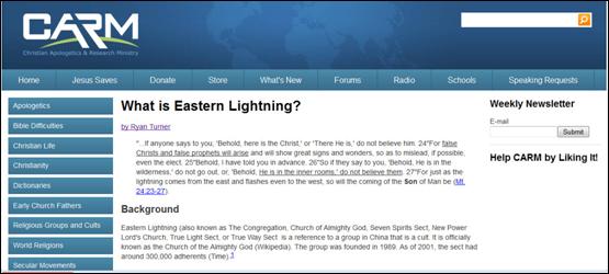 美国着名反邪教网“基督教护教与研究服务”(the Christian Apologetics and Research Ministry)刊登了北卡罗来纳大学宗教学硕士瑞安·特纳(Ryan Turner)的研究论文,为信众揭开了全能神的邪教真相。在文章中,瑞安·特纳(Ryan Turner)以《圣经》为依据,用《圣经》中的原文批驳了全能神捏造“女基督”、“大红龙”的荒谬教义。瑞安·特纳(Ryan Turner)将全能神的特点总结为“全能神为了让人入教,常常采用洗脑的方法,手段非常野蛮。它以一副‘追求正道者’的姿态渗透到基督教礼拜中,但是接下来就会引入颠覆性教义抢夺信徒。全能神的破坏性已经让一位牧师因噎废食,拒绝任何陌生人到他的教会做礼拜”。