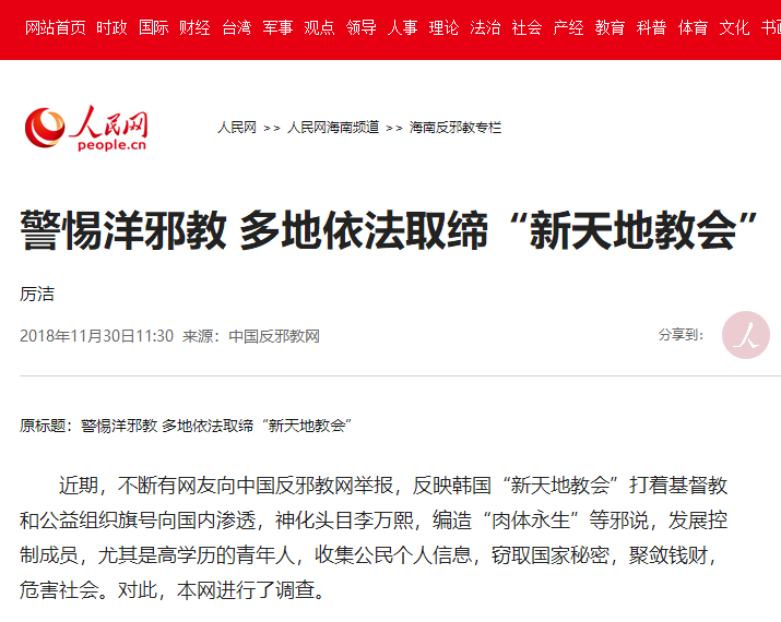 揭批韩国邪教“新天地”报道网页截图1