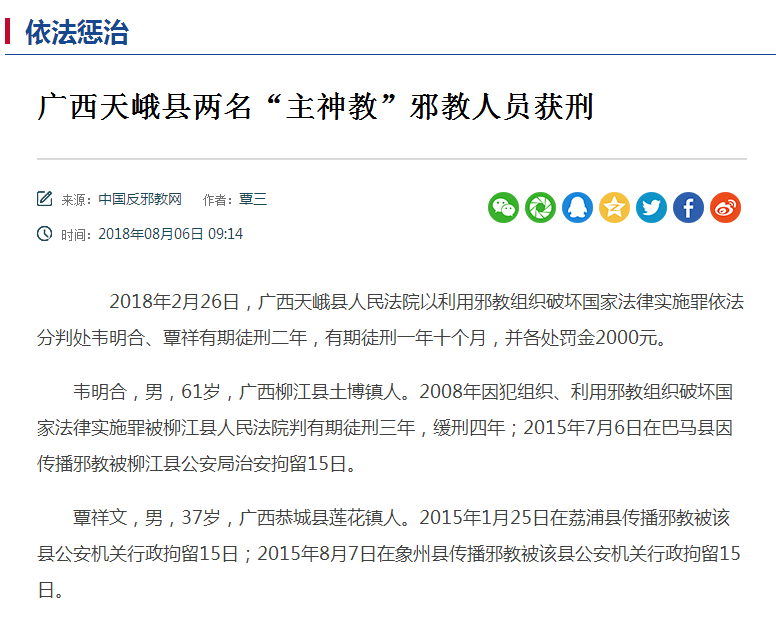 2015年11月,广西贺州“主神教”邪教案宣判 3名被告人获刑。