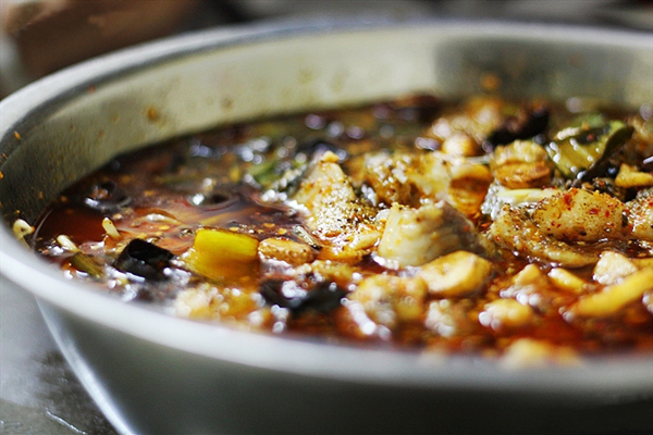 用盆盛的麻辣水煮鱼