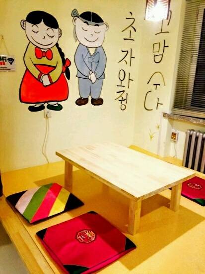 为了能验证下吃完他家是否真的能笑口常开,我还特地挑了一天心情有点小郁闷的时候,和朋友相约,来吃这家店。 走进来一看,装修风格与其他小木屋,没有什么区别,但是他家的服务人员,颜值很高嘛,脸上的笑容很亲切,温暖。现在内心里的想法就是,应该没来错地方呢。 可能来的有点晚了,但是好在朋友提前预定了,漂亮的老板娘立刻将我们领到包间,墙壁上面都是可爱的壁画。