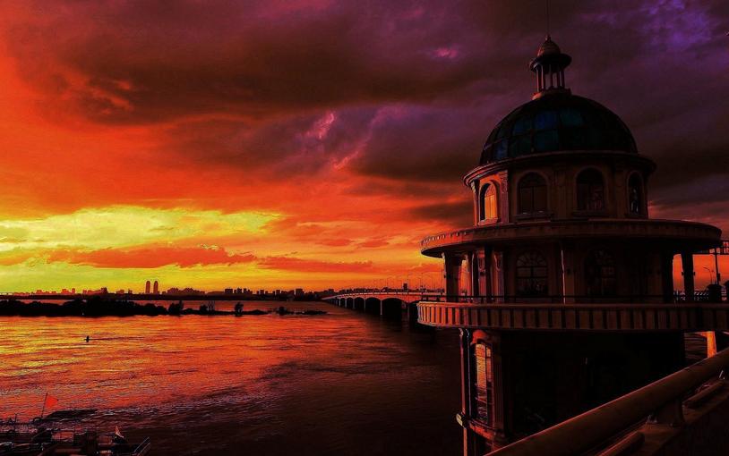 江鸥穿越霞蔚象彩色的精灵,悠闲的自由飞翔于锦滔霞光之间;一条银鱼越出水面,一个鹞子翻身,刹那间,如流动的金光又落入水里。江边的垂柳,倒映水中,枝摇水静,似七彩的锦翼随风飘曳,变幻着炫彩的丝绦;树下,一艘陈旧的老木船被主人栓在江边的水中,随着波浪的起浮,向人们诉说着曾经披风斩浪的豪迈,与被遗弃的痛苦;远处楼台上,一对恋人依偎在一起,陶醉于无限的柔情蜜意之中,江面游船的笛声也没能打扰他们幸福的温情。