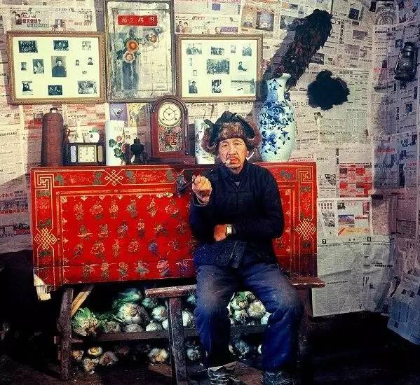 下面这张照片,涵盖了太多回忆,黑白相片、报纸糊墙、鸡毛毯子、大花瓶、时钟、水壶、大立柜、大棉袄、大烟袋,还有柜子下的大白菜。