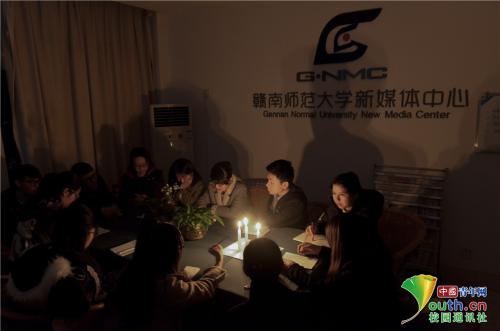 04 “地球一小时日”当天,赣南师范大学的学校官微团队14名核心成员熄灯后点蜡烛开选题会。中国青年网通讯员 苏雯 摄
