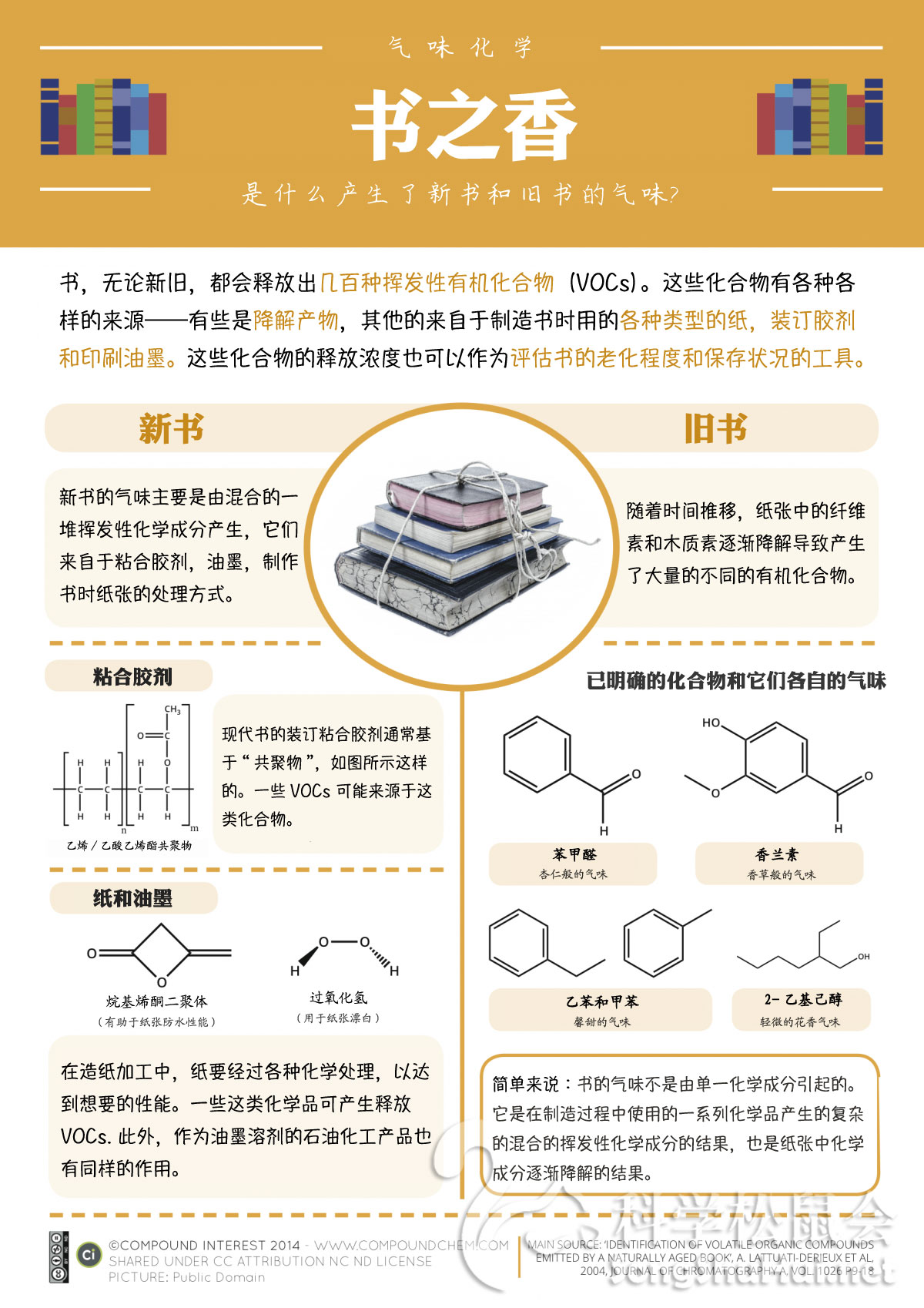 每个人都很熟悉旧书的气味,那种常出现于图书馆和二手书店的奇怪的令人陶醉的香味。同样的,谁不喜欢翻阅新买的书,深吸着新纸和新印油墨那脆生生的清香呢?与所有香味一样,书香,源于若干化学成分,因此可以检验书香的形成过程和化合物结构。