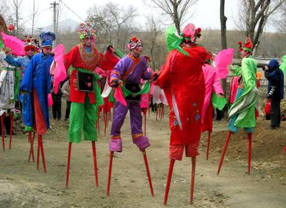 高跷是用木棍绑在腿上行走,木棍越高,要求的难度越大,表演者是传统戏装打扮。由开路棍打头儿,随之便出现肖恩、白蛇、唐僧、丑婆、姜子牙等艺术形象。由于诙谐有趣、粗犷喜人、声情并茂、时有乐哏,那红红火火的景象,给东北大年带来一片欢腾、喜庆的景象。